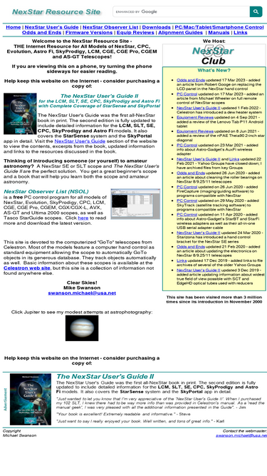 71%the nexstar resource site - web site dedicated to the nexstar, cpc, evolution, astro fi, skyprodigy, lcm, cge, cge pro, cgem and as-gt lines of computerized telescopes from celestron as well as starsense and skyportal. resources and unique information about the nexstar, cge, cge pro, cgem and as-gt scopes are the highlights of this site. a windows-based program for controlling your telescope with a pc is available for download and free use.