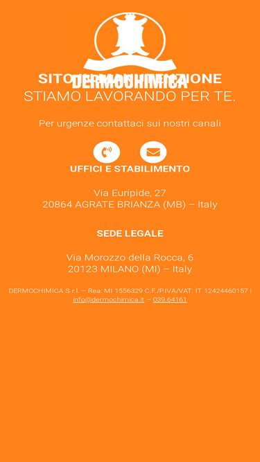 100%Sito in manutenzionestiamo lavorando per te. Per urgenze contattaci sui nostri canali Phone-volume Envelope UFFICI E STABILIMENTO SEDE LEGALE Via Euripide, 2720864 AGRATE BRIANZA (MB) – Italy Via Morozzo della Rocca, 620123 MILANO (MI) – Italy DERMOCHIMICA S.r.l. – Rea: MI 1556329 C.F./P.IVA/VAT: IT 12424460157 | info@dermochimica.it – 039.64161