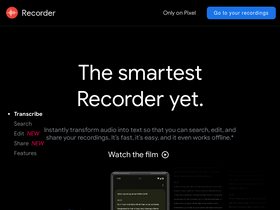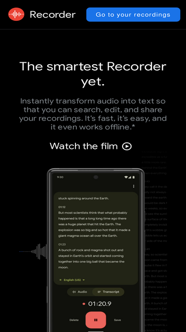 83%the recorder app available only on pixel brings the power of search and ai to your audio recordings. you can record meetings, lectures, jam sessions — anything you want to save and listen to later. recorder automatically transcribes speech and tags sounds like music, applause, and more, so you can search your recordings to quickly find the part you’re looking for. all recorder functionality can run on-device, or choose to back-up your audio files and revisit online.