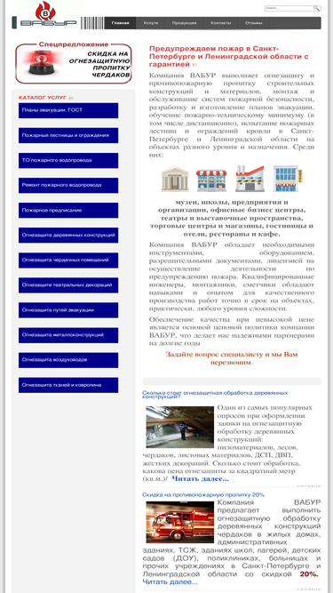 94%компания вабур выполняет огнезащиту и противопожарную пропитку строительных конструкций и материалов, монтаж и обслуживание систем пожарной безопасности, разработку и изготовление планов эвакуации, обучение пожарно-техническому минимуму (в том числе дистанционно), испытание пожарных лестниц и ограждений кровли в санкт-петербурге и ленинградской области