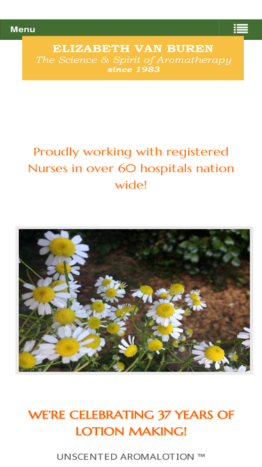 87%Proudly working with registered Nurses in over 60 hospitals nation wide! WE'RE CELEBRATING 37 YEARS OF LOTION MAKING! UNSCENTED AROMALOTION ™ LAVENDER ALOE AROMALOTION ™ PEPPERMINT AROMALOTION LAVENDER AROMALOTION AVAILABLE IN 8oz, 1/2 gallon & gallon sizes (with pumps) - inquire for case packs and larger quantities VISIT OUR SKIN CARE PAGE Wholesale & Practitioner pickup available by appointment only. Call or email to place your order. Our office processes orders Mon - Thu, until 2:30 pm PT. 831-425-8218 sales@elizabethvanburen.com With the new year arriving, so are our new prices. If you are a practitioner or wholesale supplier, please reach out to receive our 2022 price sheets. WHAT'S NEW AT EVB?In early 2018, Larry and Elizabeth Jones' children voted to enhance and preserve the legacy of their parents, and Alex and Cottie Rood joined the executive team. Cottie Rood took the role of CEO and has worked tirelessly behind the scenes to insure the health and well-being of our company, so we can continue to offer our customers excellent products and essential oils. As we move towards new ownership, we are excited to support Elizabeth and Larry in realizing their lifelong dream ~ to enhance our lives through The Science and Spirit of Aromatherapy.
