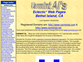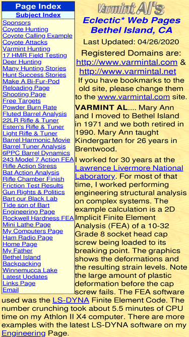 100%a multi-faceted eclectic site, varmint hunting, coyote calling, free calling sound files, field testing the 17 hmr, mini lathe improvements, example finite element analysis, high sierra backpacking, and bichon frise obedience udx.