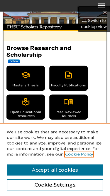 92%the fhsu scholars repository brings together all of the university's research under one umbrella, with an aim to preserve and provide access to that research to a global audience. it is primarily open access and is designed to make scholarship from the fort hays state university community easy to find, share, cite, and use. fhsu scholars repository is sponsored and maintained by forsyth library.