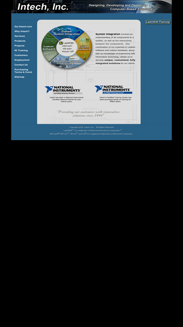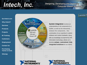 100%system integration, test and measurement, data acquisition, remote monitoring, custom hardware and software using labview, microsoft asp.net, visual c#, sql server and visual basic. intech is national instruments certified alliance partner and maintains in-house certified training center.