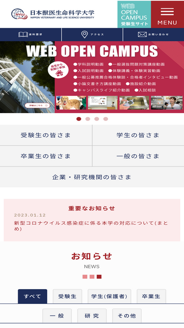85%日本獣医生命科学大学(ニチジュウ)公式サイト。大学案内、受験生向けの入学案内、在学生向けコンテンツなど盛りだくさん。まずはオープンキャンパスに参加してみよう!
