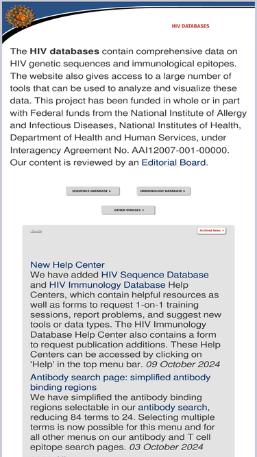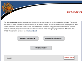 100%the hiv databases cover hiv sequences, hiv molecular immunology, hiv drug resistance mutations and nonhuman primate hiv/siv vaccine trials. each of these topics are available through a dedicated database, extensively annotated and with many specialized search and analysis tools. the hiv databases are supported by the nih and doe and maintained at the los alamos national laboratory.