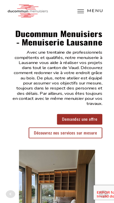 la menuiserie ducommun de lausanne crée des pièces uniques et sur mesure. cette petite entreprise familiale lausannoise est composée de professionnels certifiés depuis 4 générations, qui usent de leur talent dans de nombreux ouvrages (portes, agencement, fenêtres, rénovations, ei30, armoires ..). précis, rapide, soigneux, des menuisiers lausannois pour vous servir.