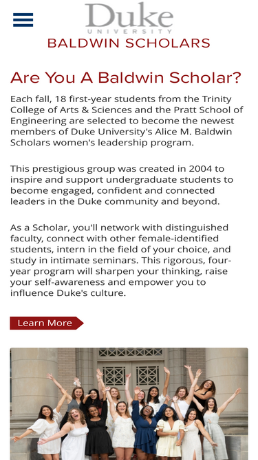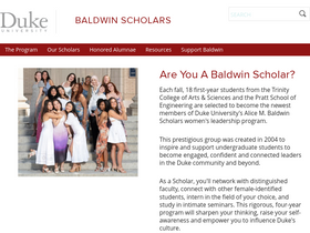 88%The Alice M. Baldwin Scholars Program inspires and supports undergraduate students to become engaged, confident and connected leaders in the Duke community and beyond. Up