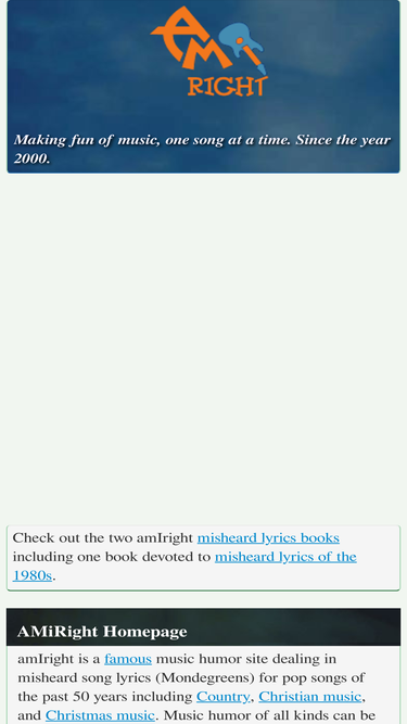 99%amIright is a famous music humor site dealing in misheard song lyrics (Mondegreens) for pop songs of the past 50 years. Music humor of all kinds can be found here, such as song parodies, jokes, quotes, band name manipulations, lyrics observations, and music trivia.