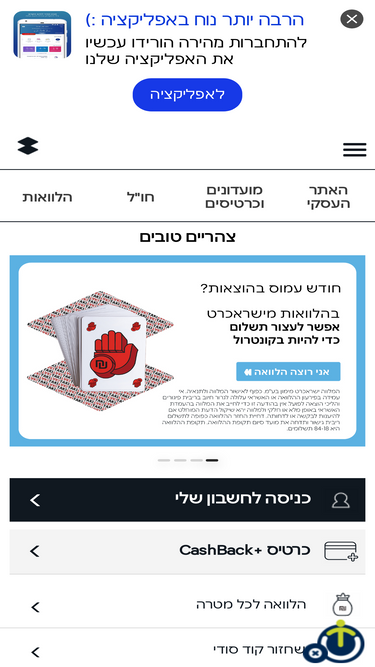 87%באתר ישראכרט ניתן לבצע פעולות בחשבונכם הפרטי או העסקי, לקחת הלוואה, להזמין כרטיסי אשראי, פתרונות תשלום ואשראי לעסק וליהנות מהטבות ייחודיות
