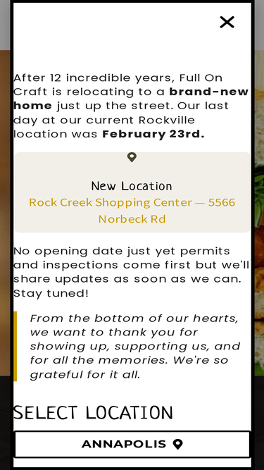 90%Full On Craft Eats and Drinks menu, including sandwiches, salads, craft beer and fine wine.