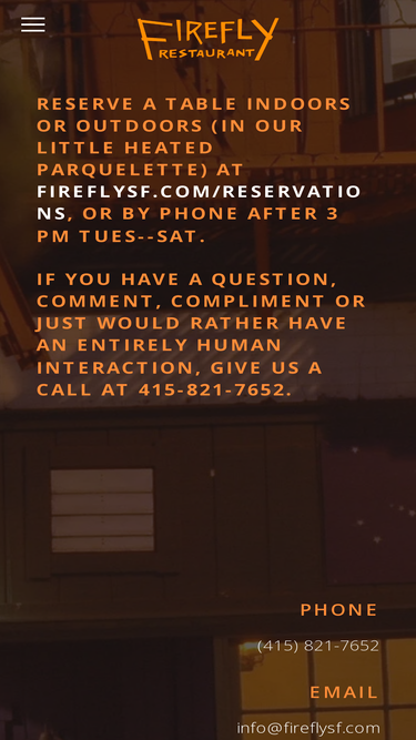 95%Firefly is an contemporary American Restaurant in San Francisco’s Noe Valley. We serve healthy, seasonal heartfelt comfort cuisine, with special attention to vegetarian and gluten free diners.