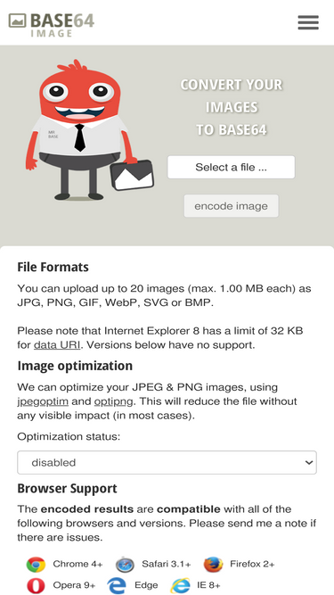 100%optimize your images and convert them to base64 online. drag & drop your files, copy to clipboard with a click and use the result in html and css.