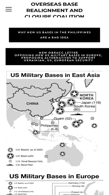 92%This is the website for the transpartisan Overseas Base Realignment and Closure Coalition. Visit for information about US military bases abroad and efforts to make the US and the world safer and save billions by closing wasteful and dangerous bases.
