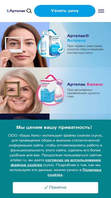 92%Артелак - линейка увлажняющих растворов для глаз. Содержит гиалуроновую кислоту, облегчает симптомы сухого глаза!