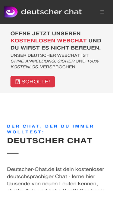 88%deine ultimative, kostenlose chat-community für deutschland. chatten, flirten oder freundschaften schließen – alles anonym und ohne anmeldung. dein chatroom.