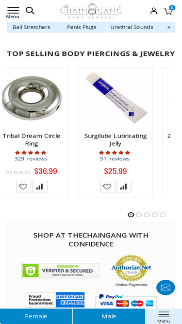 74%at thechaingang.com we offer some of the highest quality pieces at 1/3rd the price of some of our competitors. if you are looking for anything from exquisite 14k gold nipple barbells with a matching belly ring, to a ball weight or penis plug even, you need to see us first! we are known for our quality, and huge selection, but our prices are truly amazing for the pieces, but that is because you are buying direct from us ! we have been in business since 1992 and that is because of quality and always putting the customer first. come visit us and take a look around the store, you will not regret you spent the time with us.