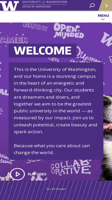 74%This is the University of Washington: a stunning campus in the heart of an energetic, forward-thinking city. Our students are dreamers and doers, and together we tackle big issues with curiosity,...