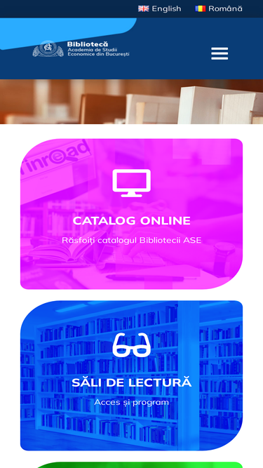 77%CATALOG ONLINE Răsfoiți catalogul Bibliotecii ASE SĂLI DE LECTURĂ Acces și program RESURSE ELECTRONICE Acces și tutoriale BIBLIOTECA ONLINE Resurse disponibile online SERVICII Împrumut publicații, instruire etc. TUTORIALE Resurse, servicii și colecții Noutăţi Program Bibliotecă (sălile de lectură