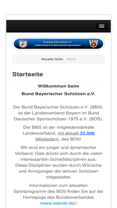 der bund bayerischer schützen e.v. (bbs) ist der landesverband bayern im bund deutscher sportschützen 1975 e.v. (bds). wir sind ein junger und dynamischer verband. dies drückt sich durch die vielen interessanten schießdisziplinen aus. diese disziplinen wurden durch wünsche und anregungen der aktiven schützen mitgestaltet. informationen zum aktuellen sportprogramm des bds finden sie auf der homepage des bundesverbandes (www.bdsnet.de)!