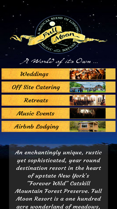 66%Full Moon Resort is a year-round destination. This magical Catskills wedding venue also hosts world-class retreats, a pioneering music program, and a Winter Wonderland hotel for families, couples, and groups. Enjoy diverse lodging, exceptional dining, and a sparkling new four-season heated pool and hot tub. Explore 100 acres of forests, meadows and streams just 2.5 hours from NYC, 10 minutes from Belleayre Mountain Ski Center, and a short drive to legendary Woodstock, NY.