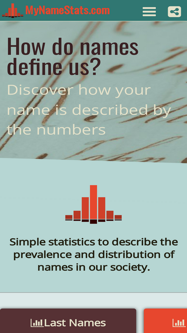73%mynamestats.com numerically describes the prevalence and distribution of names in our society. simple statistics are used to describe the people that share the same names. you can find information about popularity, race, hispanic origin and ethnicity, as well as similarity. for first and last names.
