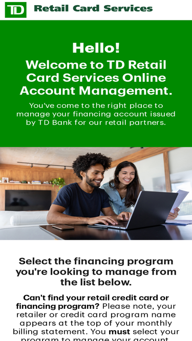 74%log in to manage your td financing account online. view your statement, pay your bill, and update your account preferences. brought to you by td retail card services.