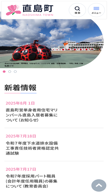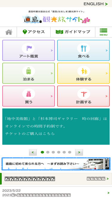 100%直島がもっと楽しくなる、観光情報が満載!旅館などの宿泊施設、食事・買いものスポットの紹介、イベントのお知らせなど。(直島町観光協会提供)