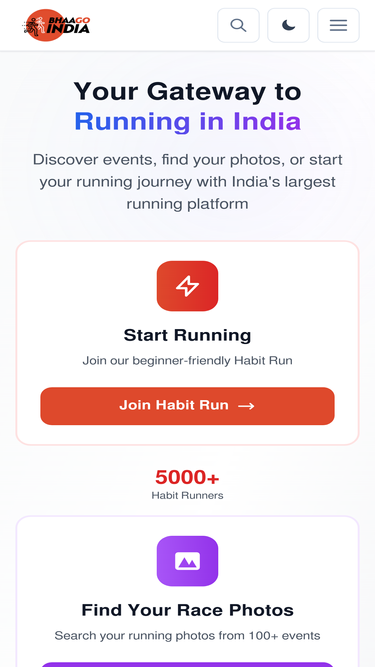 92%Discover 5000+ running events across India. AI-powered race photo search, instant timing results, free pace calculators & vibrant running community. Join 10,000+ Indian runners today!