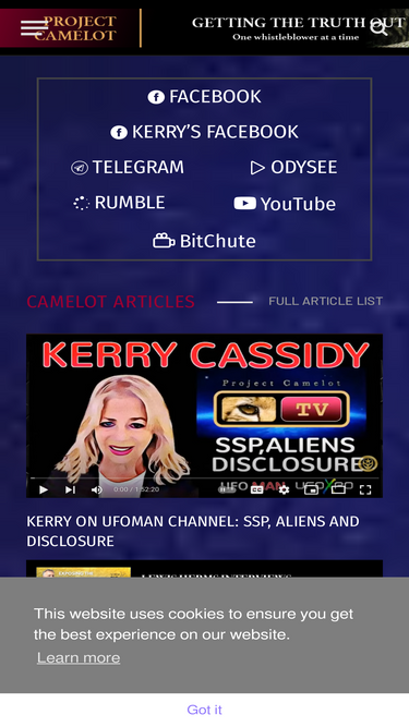 99%Kerry Cassidy is the CEO/ Founder of Project Camelot. Kerry is a documentary filmmaker/investigative journalist, author and well known host of Project Camelot TV broadcasting weekly live shows . PROJECT CAMELOT http://projectcamelot.tv aka projectcamelotportal.com - is a leader in the alternative media sector. Kerry travels the world conducting interviews and documenting the testimony of whistleblowers with above top secret clearances as well as authors, researchers and experiencers covering conspiracies, the secret space program, black projects, ETs, kundalini and ascension and free energy. She speaks at conferences around the world and is considered one of the leaders of the disclosure movement. Kerry's book, "Rebel Gene: Secret Space and the Future of Humanity" documents her trip down the rabbit hole and years in Project Camelot. 5-STARS ON AMAZON! Due to censorship and demonetization by Youtube Project Camelot has now become a subscription based platform. JOIN NOW BECOME A MEMBER KERRY CASSIDY - PROJECT CAMELOT was banned and deleted from the several platforms for telling the truth about covid: WATCH OUR VIDEOS HERE: https://media.projectcamelotportal.com/ THOUSANDS OF free videos...on ODYSEE.COM RECENT VIDEOS ON MY WEBSITE AND RUMBLE.COM Kerry Lynn Cassidy Founder / CEO Project Camelot skype: snowjaguar http://projectcamelot.tv TELEGRAM: intel and updates daily…. https://t.me/projectcamelotKerry JOIN US AND SUBSCRIBE to support our work: https://projectcamelotportal.com/join/ DISCLAIMER Project Camelot does not necessarily agree with or endorse all of the views represented by those we interview or have on our radio shows, internet TV shows or other broadcasts and productions.What Camelot is about is the investigation into the mysteries that surround us. We are all, in a sense, investigators of our world. And while we, as individuals, may not agree with everything presented on our site, we fully support freedom of thought and speech as well as the Quest fo