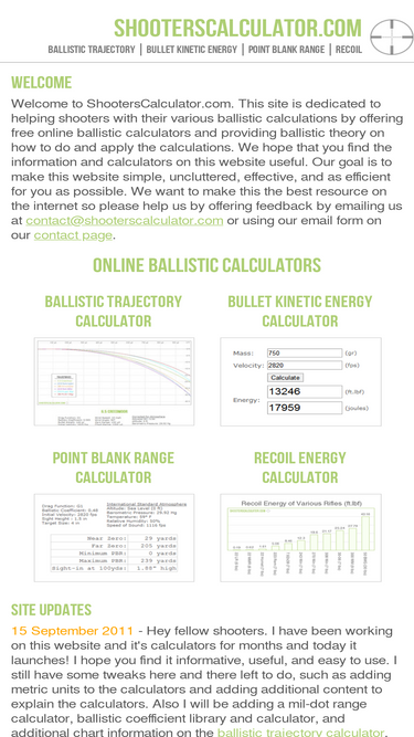81%online ballistic calculators to help shooters calculate bullet trajectory, bullet kinetic energy, maximum point blank range, and recoil. explains how to make these calculations and produces charts and graphs that compare various firearm cartridges and firearms.