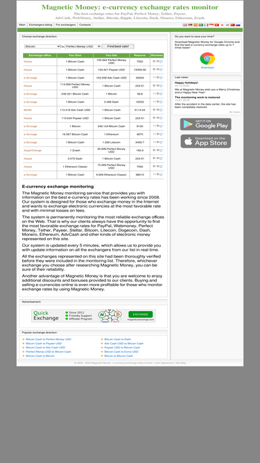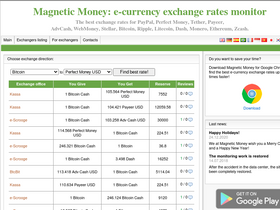 100%magnetic money: an e-currency exchange monitoring service allows you to find profitable exchange rates for wmz, wme, wmg, wmx, paypal, webmoney, perfect money, tether, payeer, advcash, ethereum, stellar, bitcoin and other electronic currencies.