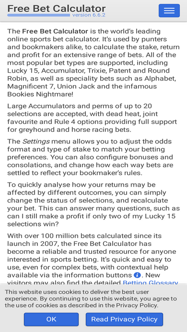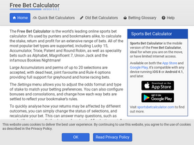 99%The bet calculator for users of older desktop computers and laptops. Calculate the returns for 28 different bet types, including Lucky 15, Accumulator, Round Robin and many more.