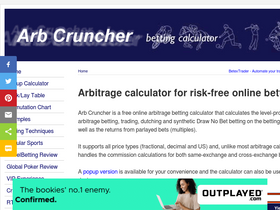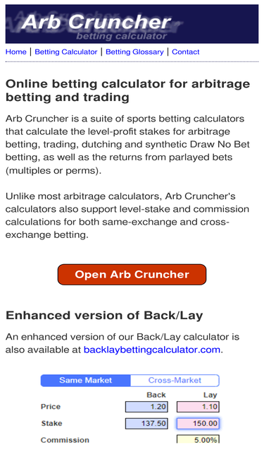 100%arb cruncher is an arbitrage calculator that calculates the optimal stakes for level-profit arbing, dutching, trading & synthetic draw no bet betting. it's completely free to use and has been designed for your maximum convenience. it supports multiple betting exchange commission configurations and allows you to enter fractional, exchange-friendly decimal and us prices.