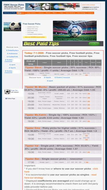 100%free-soccer-picks provides free predictions for soccer also called tips.