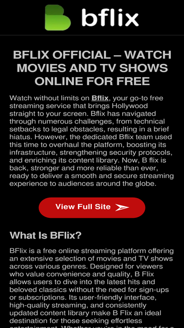 95%Watch unlimited HD movies and TV shows for free on Bflix. Enjoy ad-free streaming with no sign-up required. Start watching now!