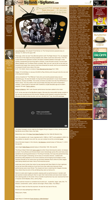 85%craig's bigbands and bignames featuring historic reviews and photos from performers like dean martin, sinatra, sammy davis jr., tony bennet, liberace, dinah shore, duke ellington, benny goodman, swing, big band era music, jazz, golden age music