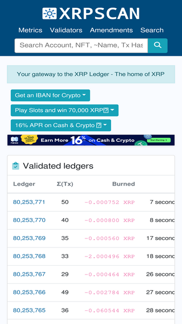 XRPSCAN is the leading explorer for the XRP Ledger, the home of XRP. Search Account, NFT, AMM pools, Transactions, Ledgers, Validators, Amendments, Metrics and XRP Rich list on xrpscan.com