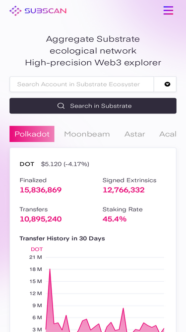 67%Subscan is a one-stop blockchain explorer solution powered by “EaaS” (Explorer as a Service), focusing on the Substrate ecosystem and EVM support. We deliver real-time data, analytics, and smart contract exploration across nearly 100 networks, empowering you to efficiently explore the Web3 universe.