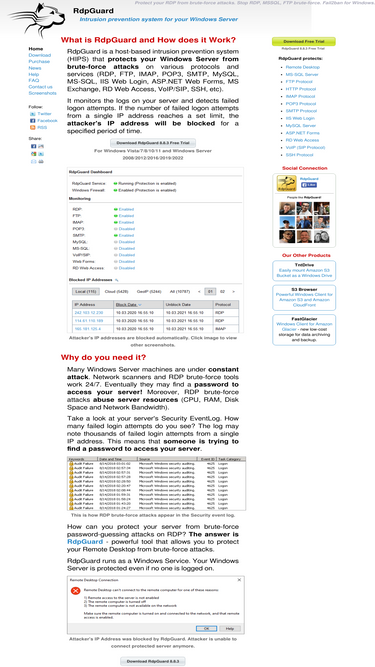 87%rdpguard protects your remote desktop (rdp), pop3, ftp, smtp, imap, mssql, mysql, voip/sip from brute-force attacks by blocking attacker's ip address. fail2ban for windows.