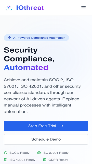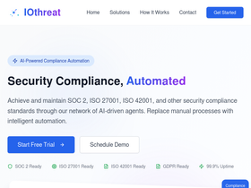 80%Automate your security compliance with IOThreat. Our AI-driven agents manage hundreds of requirements for SOC 2, ISO 27001, and more, saving you time, money, and effort for peace of mind.