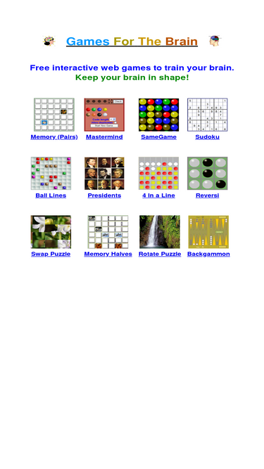 92%games for the brain.play free online web games,pair game,sudoku,daily crossword,tetris,codebreaker,memory,guess the phrase,guess the flag,guess the name,arrange numbers,towers of hanoi,peg solitaire,tictactoe,samegame,reversi,fifteen puzzle,gem puzzle, boss puzzle, game of fifteen, mystic square, 2048, chess.learn by playing about us presidents.train your brain with interactive games.