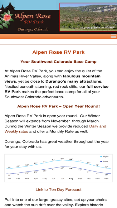 100%Directions to Alpen Rose RV Park, Durango's highest rated RV Park, conveniently located 2 miles from Historic Durango, Colorado in the scenic Animas River Valley. Nestled beneath stunning, red rock cliffs. Daily and weekly rates.