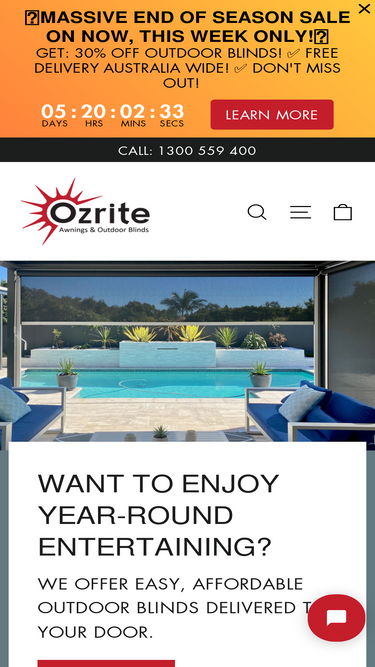 78%At Ozrite, we proudly make a wide range of premium Outdoor Blinds. Shop our external range, including outdoor rollers, shade, patio, café blinds, and window awnings, with motorised and easy DIY options. Order online for Free Delivery Australia-wide!