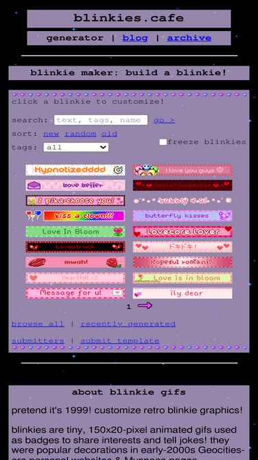 81%make your own blinkies! browse blinkie styles and add any text you want. blinkies are tiny gifs; they're great badges for your site, stream, blog, or messages. blinkies were popular decorations in early-2000s geocities-era personal websites.