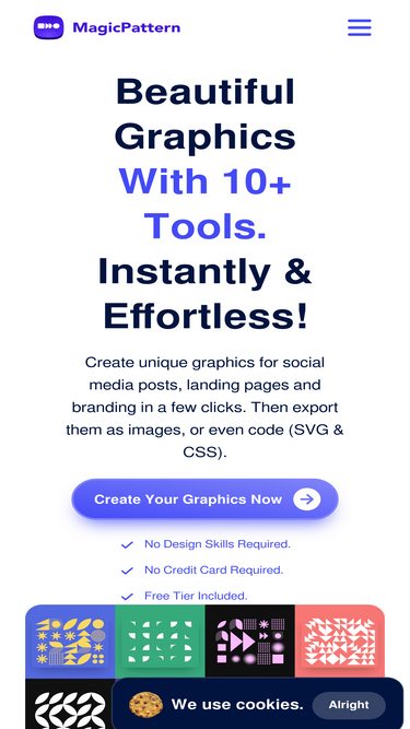 100%Create Pro Visuals with MagicPattern. Generate SVG/CSS patterns, gradients and organic shapes to brand your product and social media posts.