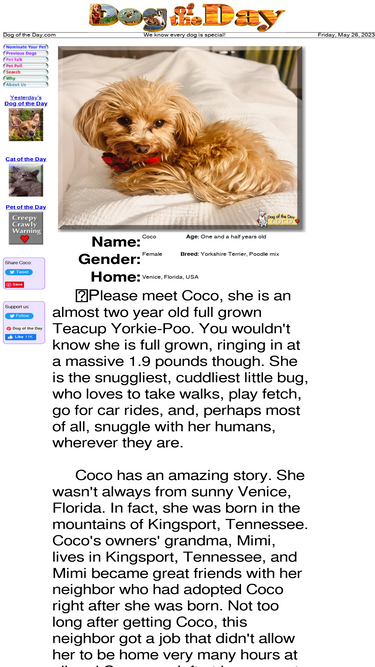 62%dog of the day features a new dog story and photo of what makes your dog wonderful every day since 1998. dog of the day is a simple award-winning, family-friendly, free, and fun website.