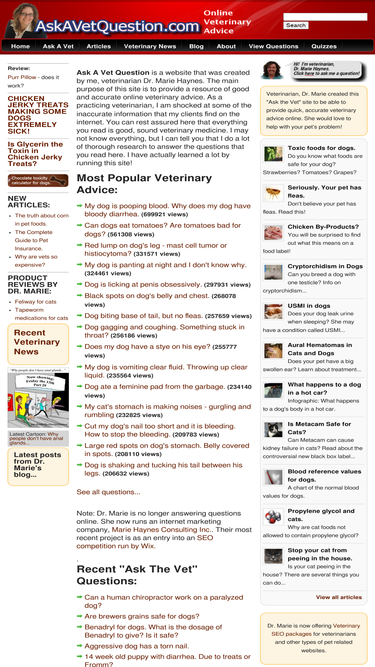 100%dr. marie offers compassionate and accurate veterinary advice. ask a vet about your dog, cat or pocket pet. read through previously answered questions.