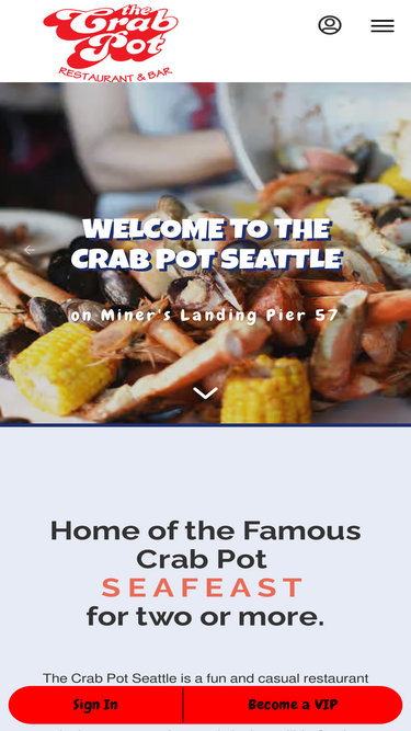 98%the crab pot seattle in bellevue, wa. the crab pot seattle is a fun and casual restaurant specializing in delicious seafood. what makes this particular restaurant famous is its incredible seafeast. there are four different varieties of seafeast but they all have one thing in common: giant steamed buckets of seafood that are dumped directly onto the table. the most popular is the alaskan which comes with king crab, snow crab, dungeness crab, steamed clams, shrimp, pacific mussels, andouille sausage, red potatoes and corn on the cob. for those looking for a more traditional entrée, the crab pot seattle has a wide variety of options. the rest of the menu is made up of fried seafood, grilled seafood, chicken, burgers and sandwiches. while the seafood options are delicious, there are plenty of beef and chicken dishes as well like the colossal bacon cheeseburger, barbecue ribs and grilled chicken breasts with seasonal vegetables. located inside miner's landing pier 57 "main mall entrance". we have amazing waterfront dining views and a large outdoor patio available.