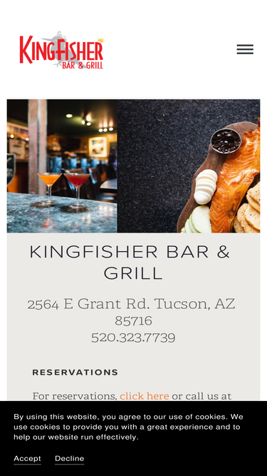 100%Visit the locally owned Kingfisher Bar & Grill in Tucson for award-winning fresh seafood, fish & chips, oysters, shrimp, fresh fish, grilled meats & American food! Extensive award-winning American wine list, happy hour, handcrafted cocktails & martinis, certified sommelier, private &